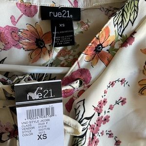 Rue21 blouse XS,new but on the back there is a black dot dot stain I didn’t noticed when i boight it i thought its part of the design lol.this will fit Xs-Small