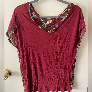 Sheer polyester front. Jersey knit back. Scoop neck back with criss cross design
