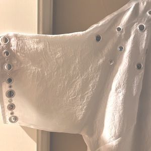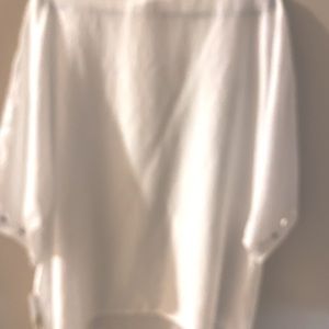 Soft, shiny, shirt. The small cutouts are filled with a shiny mirror-like material. This is a stunning blouse that can be worn casually with jeans or dresses up with a skirt or slacks.