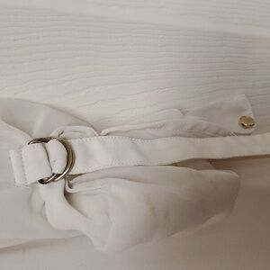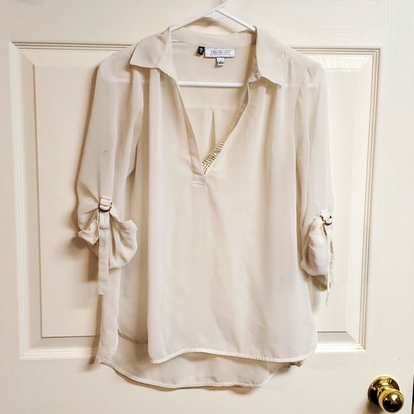 cream colored silky blouse. 3/4 sleeves or can be let down for long sleeves.
