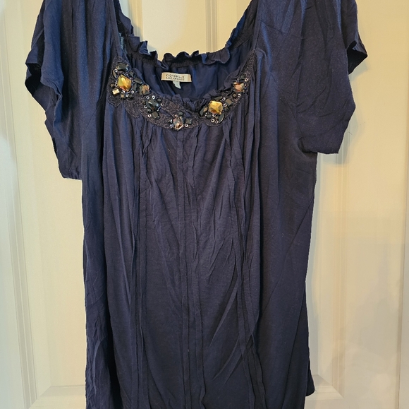 Navy Blue jeweled neckline. By: Bordeaux Los Angeles. 1X nylon/spandex shell