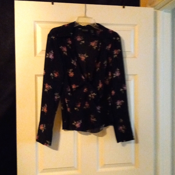 black rose floral blouse, collar, long sleeve, split cuffs, deep v neck for wearing with camisole, pull on