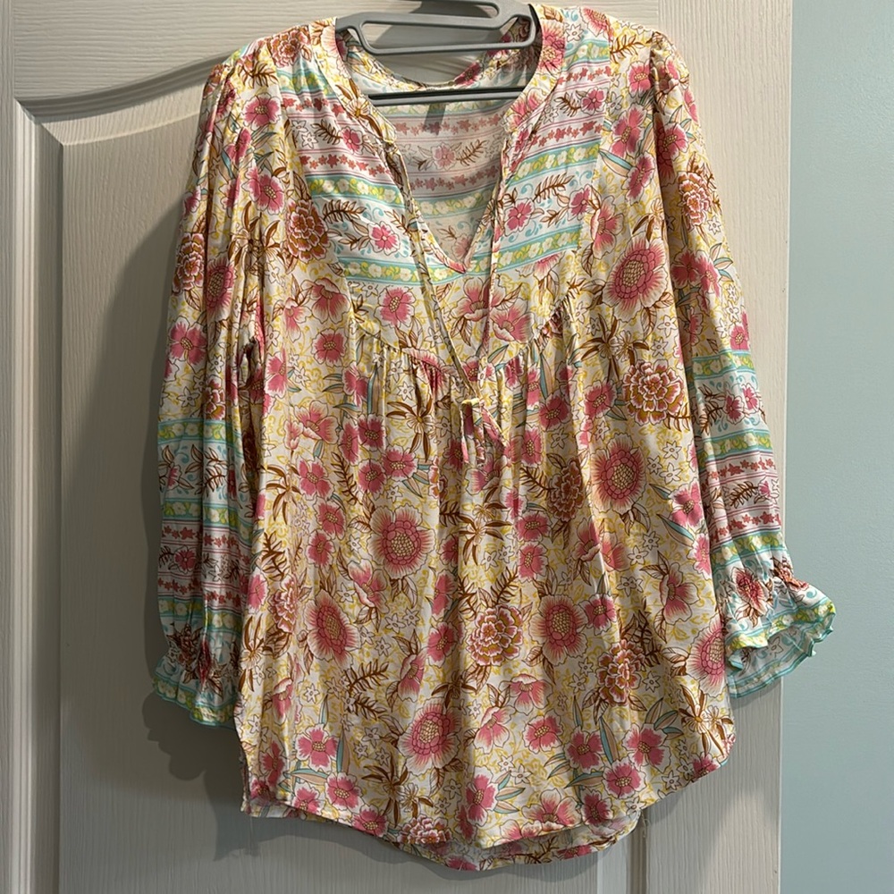 Um Gee large pink and tan with blue blouse