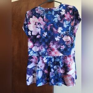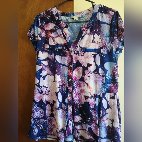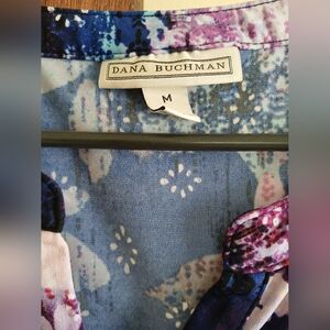 Dana Buchman short sleeve blouse. tapers at waist. buttons up. size medium.