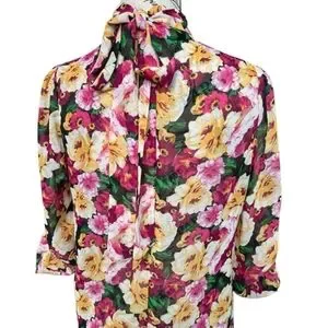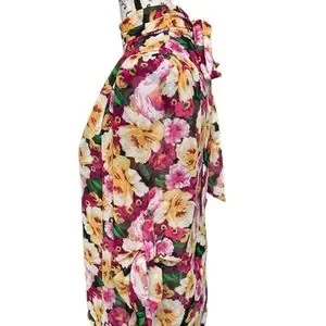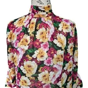 Gorgeous XTaren Blouse, multicolored, floral print, long sleeves with ability to roll up, back zipper, high neck style, ties in the back around the neck as well, light and see through fabric, undergarment may be required or nude bra. Used but in very good condition.