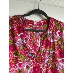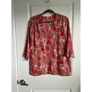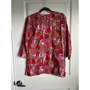 100% cotton. No brand, made in India. Has 10” slit up each side. 3/4 sleeves.