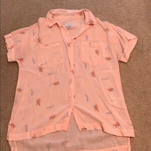 Perfect for summer and festive. This blouse is light pink and features 2 pockets and a flowered print. Size XS