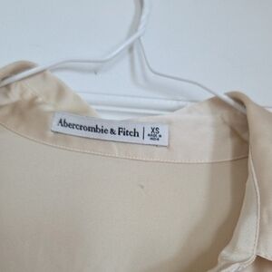 cream long-sleeve blouse in a soft satin finish. Ruched front detailing creates a flattering silhouette. Button-front closure and classic collar for a polished look. Lightweight and elegant for day or evening wear.