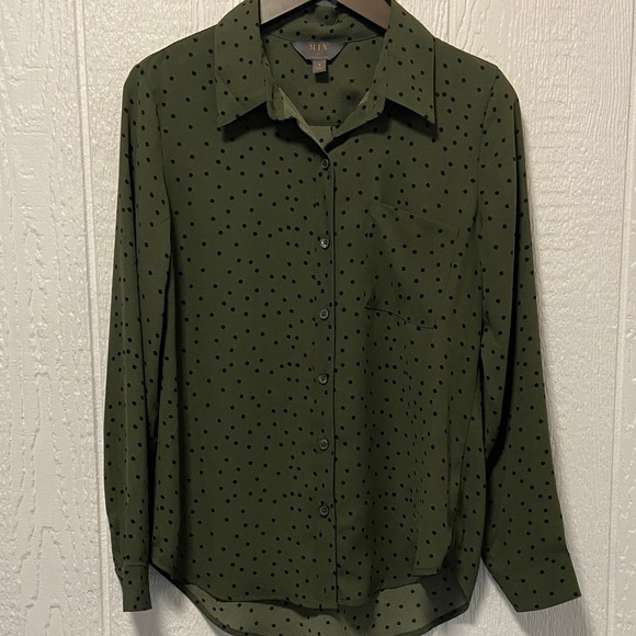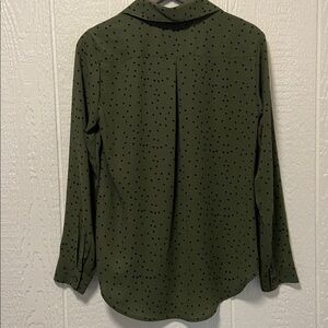 Great condition, barely worn. Size Small. Green button-up blouse, slight high-low. Underarm to underarm measures 18”. Total length measures 27 1/2”. 100% poly. Buttons at the sleeves. Smoke-free home. Offers and bundles welcome.