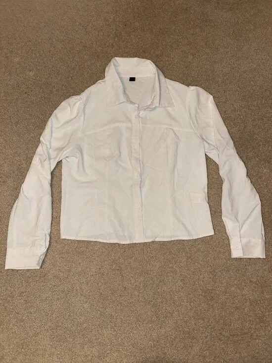 Shein white button-down blouse. Great condition, no flaws. Material is 100% polyester. Women's size XL.