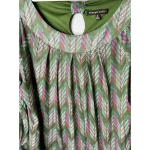 Featuring a flattering cut and comfortable fit, this size XL blouse is perfect for women of all shapes and sizes. Whether you're dressing up for a night out on the town or keeping it casual during the day, this blouse is versatile enough to suit any occasion. So why wait? Add this gorgeous pink blouse to your collection today and see for yourself why Always is a name that you can trust. Pink and green blouse with key hole opening in the back for a romance blouse for the evening or date night.