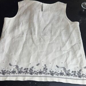 Elegant sleeveless top featuring intricate black embroidery on a white background. Perfect for casual or formal occasions.
