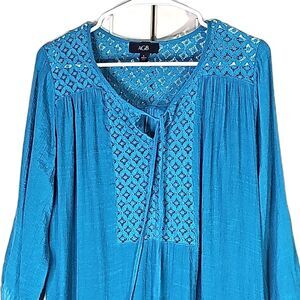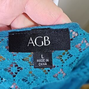 Blouse by AGB Lace Front Inset Shoulders Back 3/4 Sleeve Tie Front Teal Size L, pit to pit 22", length 28" Front, 30.5" back, sleeve 18", in good condition.