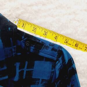 Structured yet sheer, this Calvin Klein blouse blends modern polish with a bold edge. The royal blue and black geometric print adds drama, while the lightweight sheer fabric drapes beautifully over the body. A waist tie cinches the silhouette, and the tab shoulder accents elevate the minimalist structure. Features include a point collar, front button closure, and functional front patch pockets. The long sleeves finish with classic cuffs, making it a versatile statement piece for work or elevated casualwear.