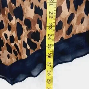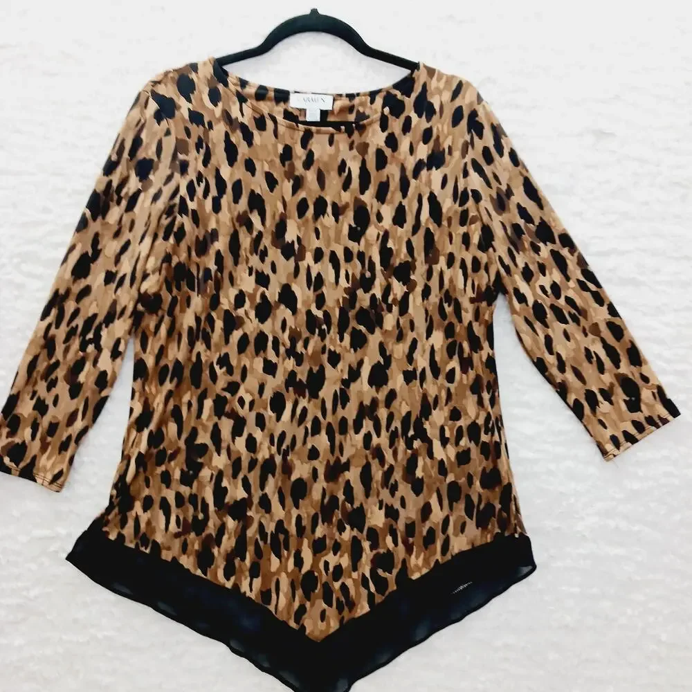 Size M Carmen Marc Valvo unleash your wild side with this fierce animal print blouse. Designed in a soft poly-spandex blend, it features a flattering scoop neckline, sleek long sleeves, and a unique asymmetrical chiffon hemline for added flair. Lightweight and easy to wear, this piece balances drama and elegance that is perfect for making a bold statement without compromising comfort.