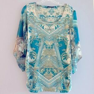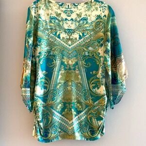 Blouse Luxurious feeling teal and tan print. Scoop neck embellished with sparkly stones. Beautiful Bell sleeves. Rushing on sides for an incredibly flattering fit. Very pretty print. All tags have been removed. Very soft and comfortable. Polyester Spandex blend. Pictures do not capture beautiful colors.