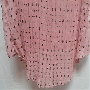 Pink blouse. Plain double pockets in front, Sports soft permanent pleats in the back. Front of blouse hangs below the waistline.back of blouse falls below the hip. Can be worn with jeans for a fresh casual look.