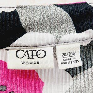 Vibrant and nostalgic, this Cato blouse brings 60s flair into the modern day. Featuring oversized daisy-style florals in pink, black, and white on a textured crinkle fabric, it captures that playful “Laugh-In” era spirit with a contemporary silhouette. The scoop neckline, flared short sleeves, and lettuce-edge hem make this top a standout for bold fashion lovers.