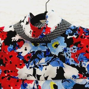 Jones New York, floral blouse, 2XL top, roll tab sleeves, collared blouse, painterly floral, romantic core, resort wear, bold red blue, button detail, plus size floral