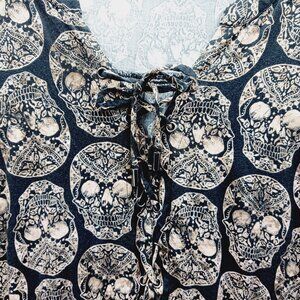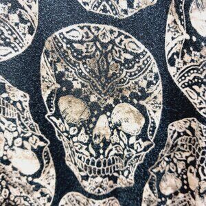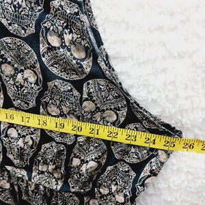 Edgy and feminine combine in this Torrid black sleeveless blouse featuring an allover skull pattern and a soft, stretchy rayon-spandex knit. The lace-up V-neckline and flowy silhouette create a flattering drape with two hidden side pockets for convenience. Perfect for casual wear or spooky-season outfits that carry attitude and comfort.