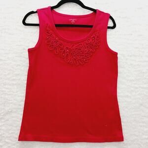 Add a little sparkle to your summer with this vibrant red sleeveless top by Laura Scott. Designed in soft, breathable 100% cotton, this petite tank features a scoop neckline and a delicate net overlay adorned with intricate floral beadwork. Whether you’re dressing it up for an evening out or layering it casually, it offers a perfect pop of charm and texture.