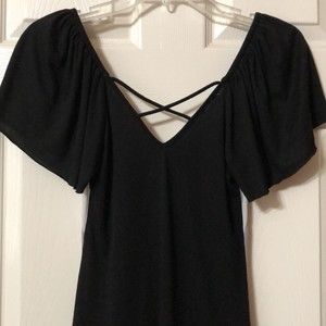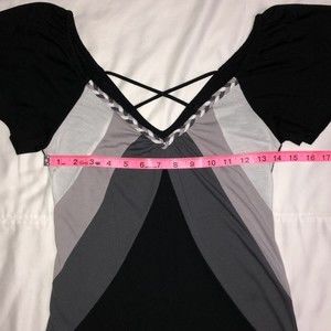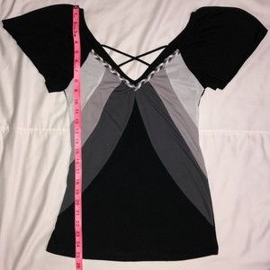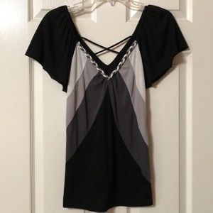 Blouse for Women, V-Neck Front and Back, Black Top with Gray and White Design, Braided V-Neck Design, Cross material on back of shoulders, cotton/rayon blend, size small