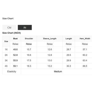Available in 2X or 3X. The photos I provided, along with the measurements, are for a size 3X. Both the images and the flat-lay measurements can serve as a reference, and the photographed size chart is also included for guidance. The size chart accurately reflects standard sizing.