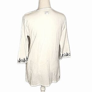 V neck Blouse by Just Be Embroidered White Blue Size Medium , pit to pit 19.5", length 30", side slits , 3/4 sleeves, in good condition.