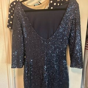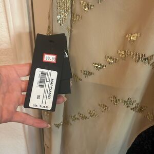 Elegant cream dress adorned with scattered gold sequins. Soft drape and subtle shimmer. Sleek silhouette for evening wear. Size xs