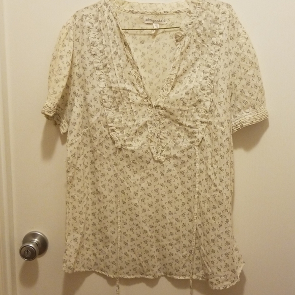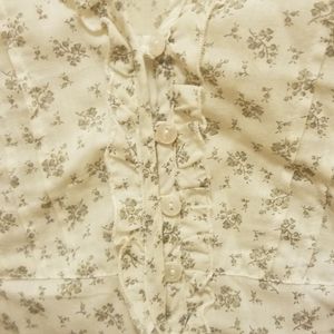 Babydoll blouse with waist tie and v neck with ruffles and flower print on it