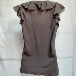 Low neckline trimmed with ruffles. The color is brown malt with the feel of satin. 100% polyester.