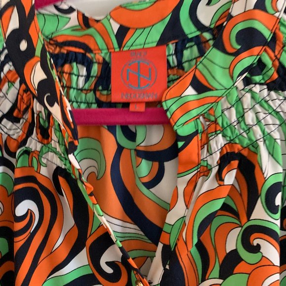 he Tracy Negoshian tunic/blouse in a vibrant orange and navy color combination is a striking fusion of bold style and sophisticated charm. Crafted with meticulous attention to detail, this versatile garment showcases a blend of rich hues that instantly captivate the eye. The vivid orange hue injects a pop of energy, while the deep navy accents add a sense of refinement and depth.
