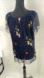 Navy blouse with floral accents. Features short sheer flutter sleeves and pleated details.