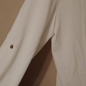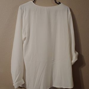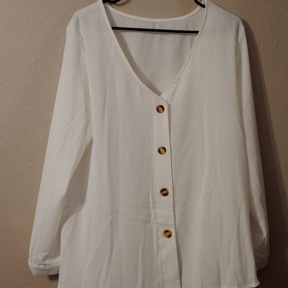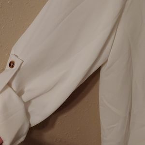 Blousy oversized button down v-neck with large buttons. Long sleeves with button cuffs that can also be rolled up and buttoned into a shorter sleeve design. New without tags