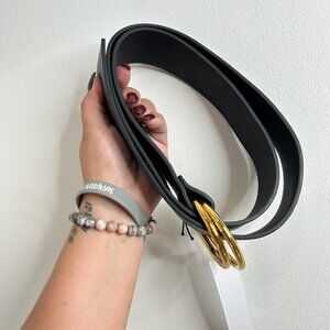 Women's wide belt featuring a double O-ring gold-tone buckle and a pebbled black strap.