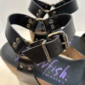 Experience the perfect blend of style and comfort with Blowfish's black sandals, featuring wide leather-look straps and a secure ankle strap with a silver buckle. The chunky platform sole and open toe design make these sandals ideal for warm weather, offering a versatile look that can be dressed up or down.