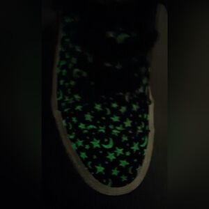 Chic sneakers with star and moon pattern. Black base with gold accents. Perfect for casual wear.
