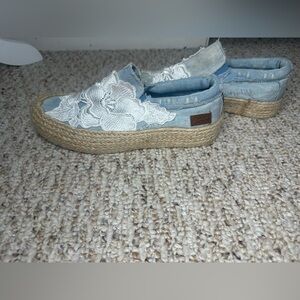 Blowfish Blue Espadrille Slip-On Shoes with White Floral Design, size 6