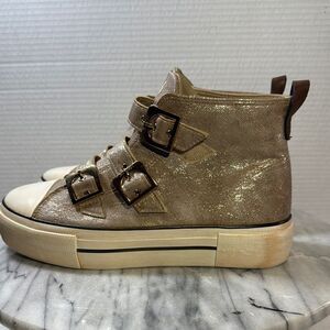 Step out in style with Blowfish's gold high-top sneakers, featuring a unique strap closure and a comfortable rubber sole. These sneakers combine fashion and function, making them a standout addition to any casual ensemble.