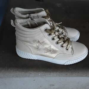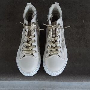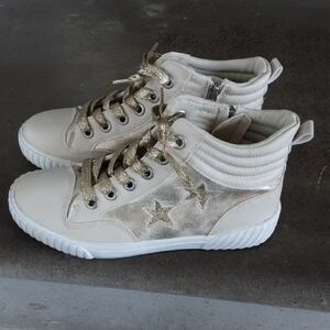 BLOWFISH MALIBU SIZE 4 Cream sneakers with stylish gold laces. Comfortable and trendy design.