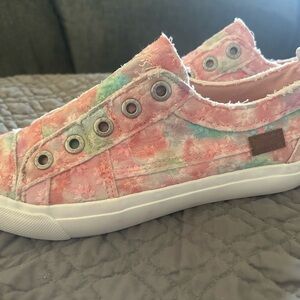 Experience the perfect blend of style and comfort with these Blowfish sneakers, featuring a pastel pink and blue tie-dye design. The slip-on style with metallic eyelets offers ease and a touch of elegance, while the white soles provide a crisp, clean finish. Ideal for casual outings, these sneakers are a must-have for a laid-back summer vibe.