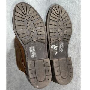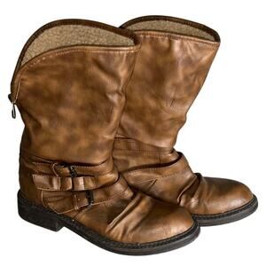 Blowfish Sz 8.5 Mid-Calf Brown Vegan Leather Boots Foldover Faux Fur Buckles
