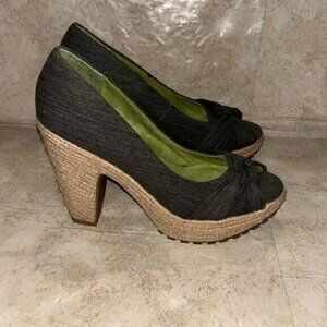 super cute boho looking denim block heels still in pretty great condition, small stain please see all pics