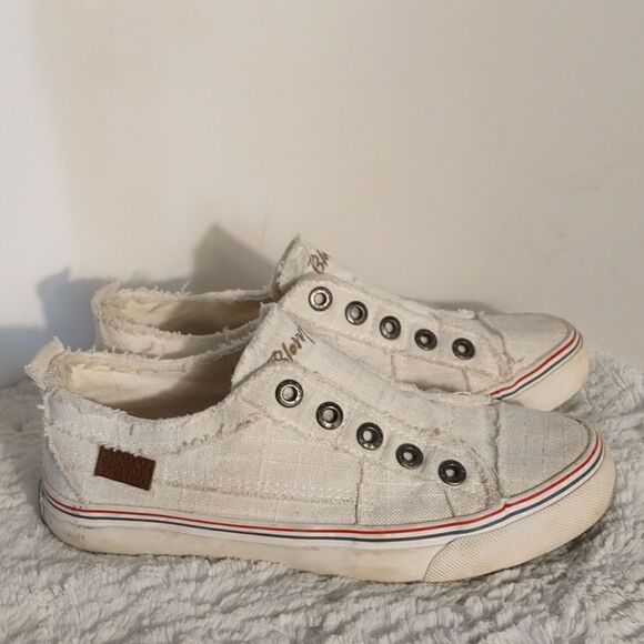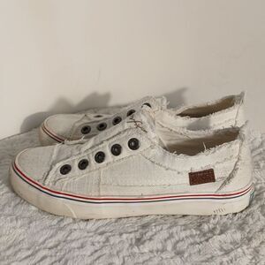 These white Blowfish Malibu laceless sneakers are a size 7. Cushioned insoles for comfort.