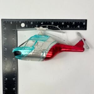 Blown Glass Helicopter Ornament Silver Red Blue with Moving Propellers 7"