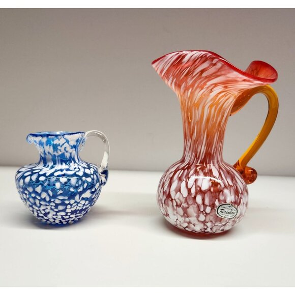 Pair of hand blown glass jug / pitcher shaped vases. Orange has an orange handle, white speckle wraparound pattern and original Rainbow glass foil sticker. Blue has a clear handle, white speckle pattern. Bulbous bottoms with spouts. Excellent condition with no chips.