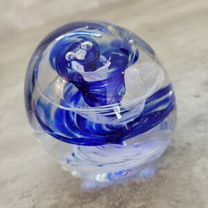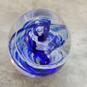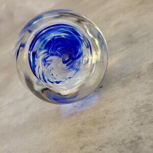 Blown Glass Paperweight Clear Cobalt Blue Spiral Inside Round Stunning