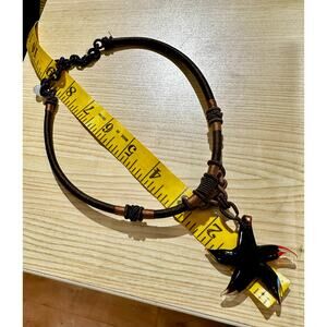 Intricate braiding makes this bold corded blown glass star necklace even more spectacular! If you're into the 90s to early Y2K look, this more modern take on the blown glass hippie necklace is a treasure. the pendant is a star, which is more unusual with orange, gold, grey and black coloring. The necklace is a thick dark brown cord with lighter almost copper cord detailing and it connects at the back with a series of loops and a glass bead toggle. There are three stretchy loops at the back so you can adjust the fit to wear it as a choker or longer or for larger necks it'll easily fit men and is very unisex. Fits around 14-17" necks.