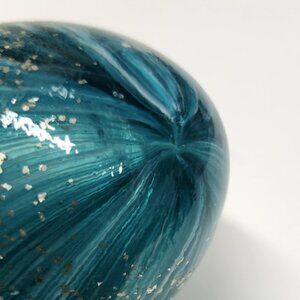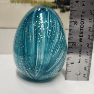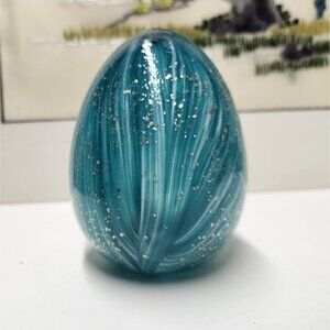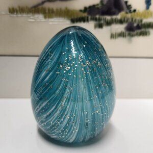 Blown glass teal, white, turquoise blue swirl design with sparkle flecks egg shape paperweight. Excellent condition, no chips, no scratches.