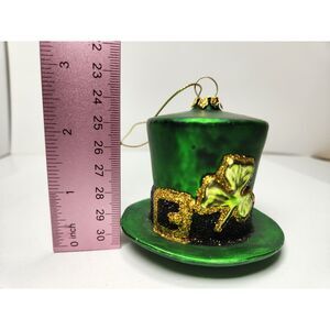 Green glass ornament shaped like a classic Leprechaun top hat. Hangs with a gold cord.